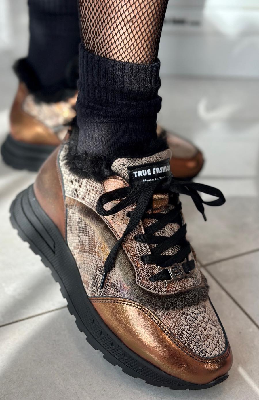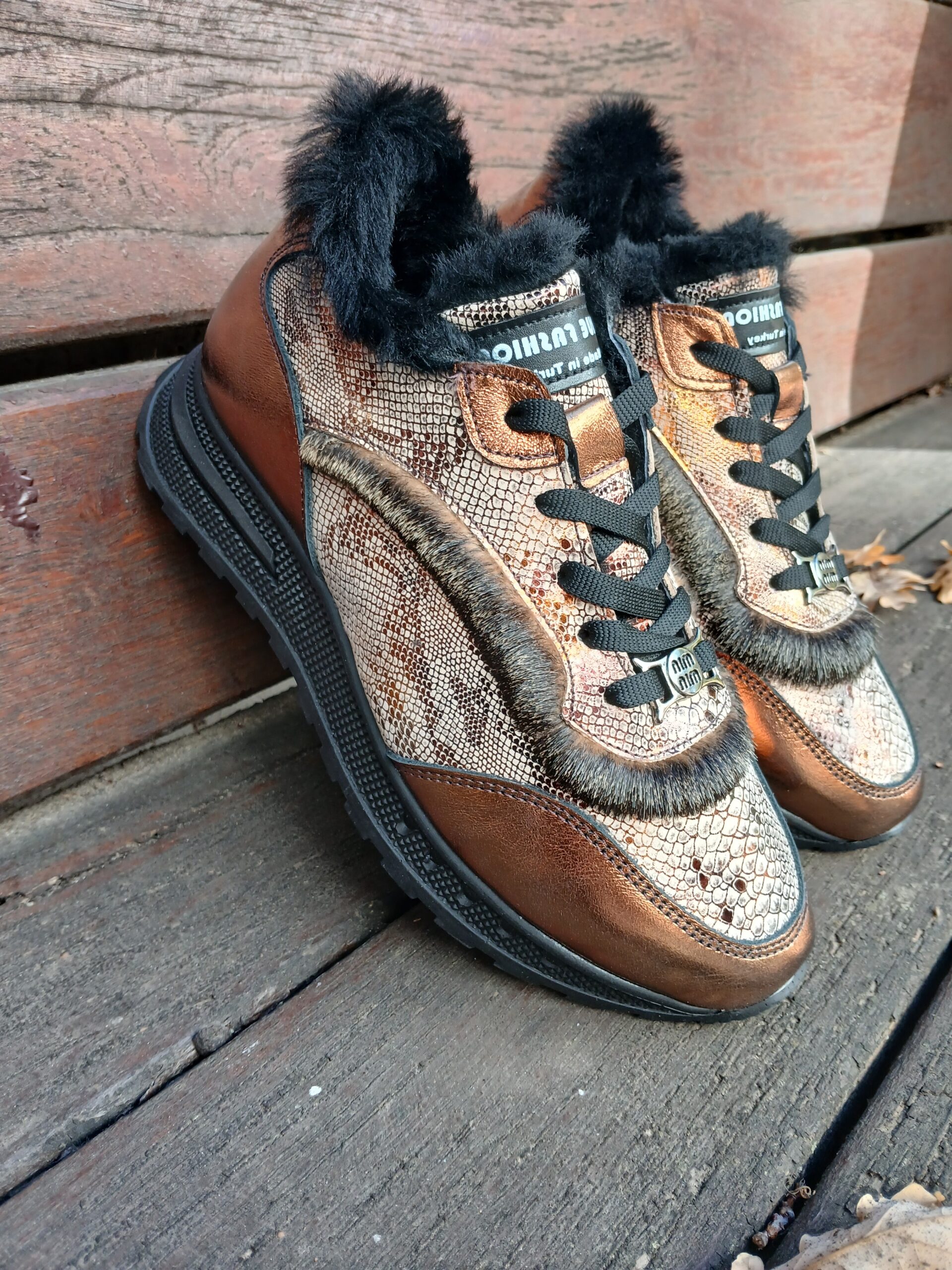 Tutto Bene orange bronze leather sneakers – with snake print and fur lining